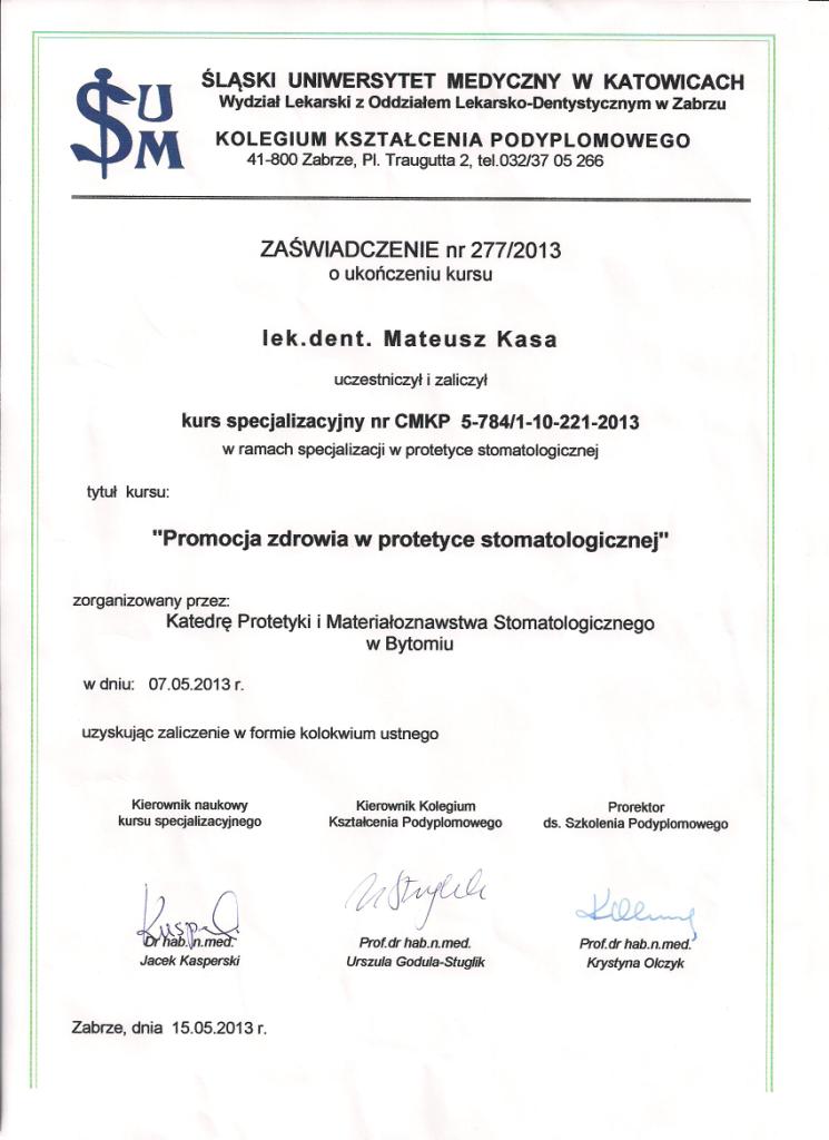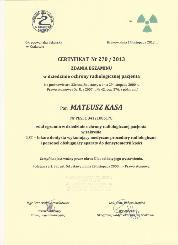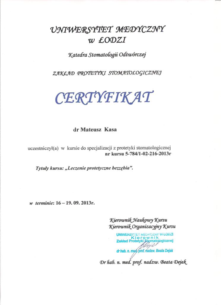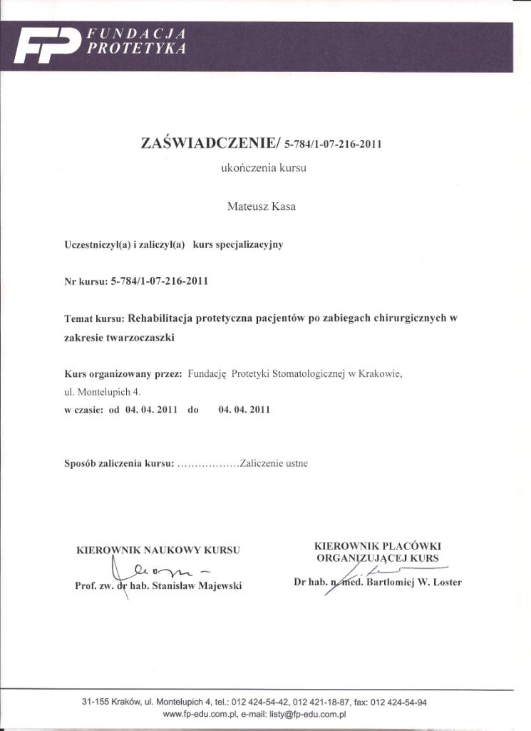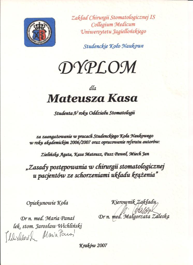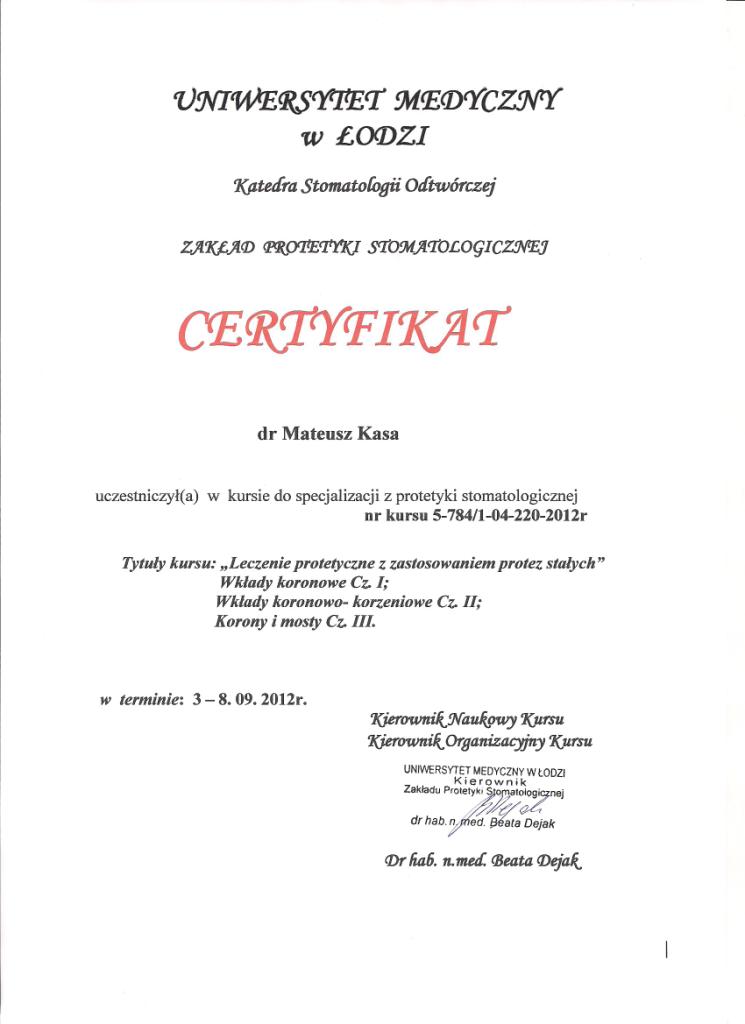 W 2008 roku ukończyłem studia na Oddziale Stomatologii Wydziału Lekarskiego Collegium Medicum Uniwersytetu Jagiellońskiego. W trakcie 5 lat rezydentury w Wojewódzkiej Przychodni Stomatologicznej zdobyłem ogromne doświadczenie w wielu dziedzinach stomatologii. W 2015 roku uzyskałem tytuł Specjalisty Protetyki Stomatologicznej. Wiedza teoretyczna i praktyka pozwala mi na interdyscyplinarne leczenie pacjentów z różnymi chorobami w obrębie jamy ustnej.