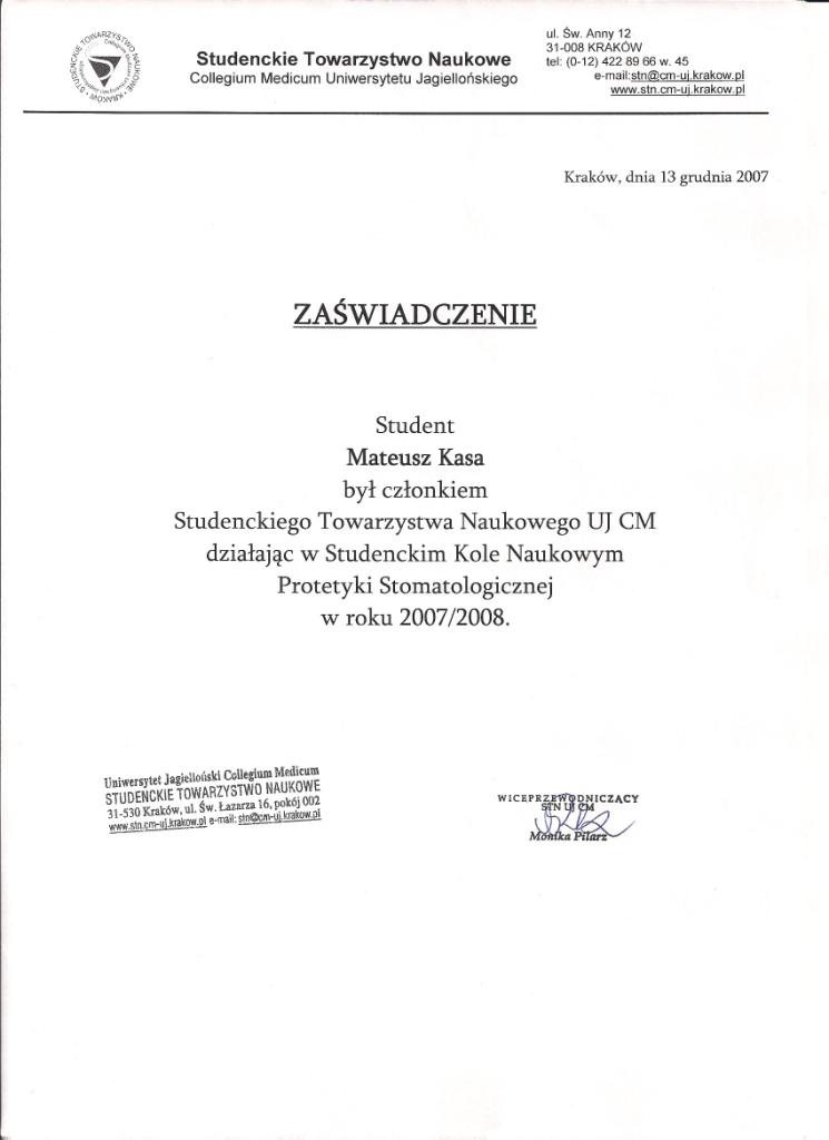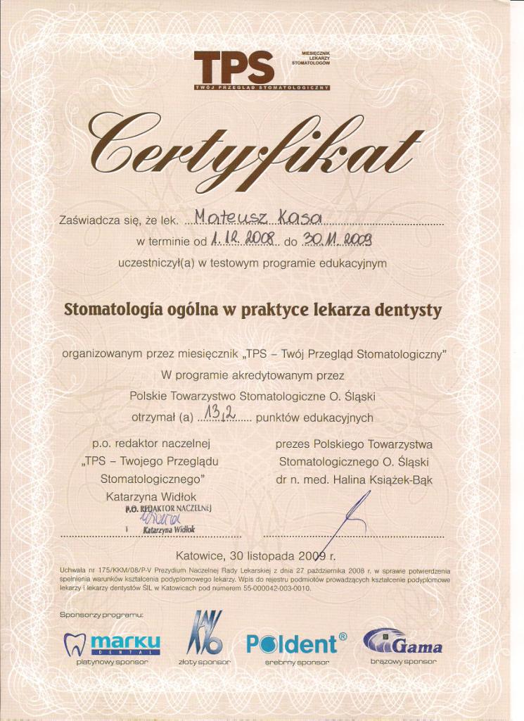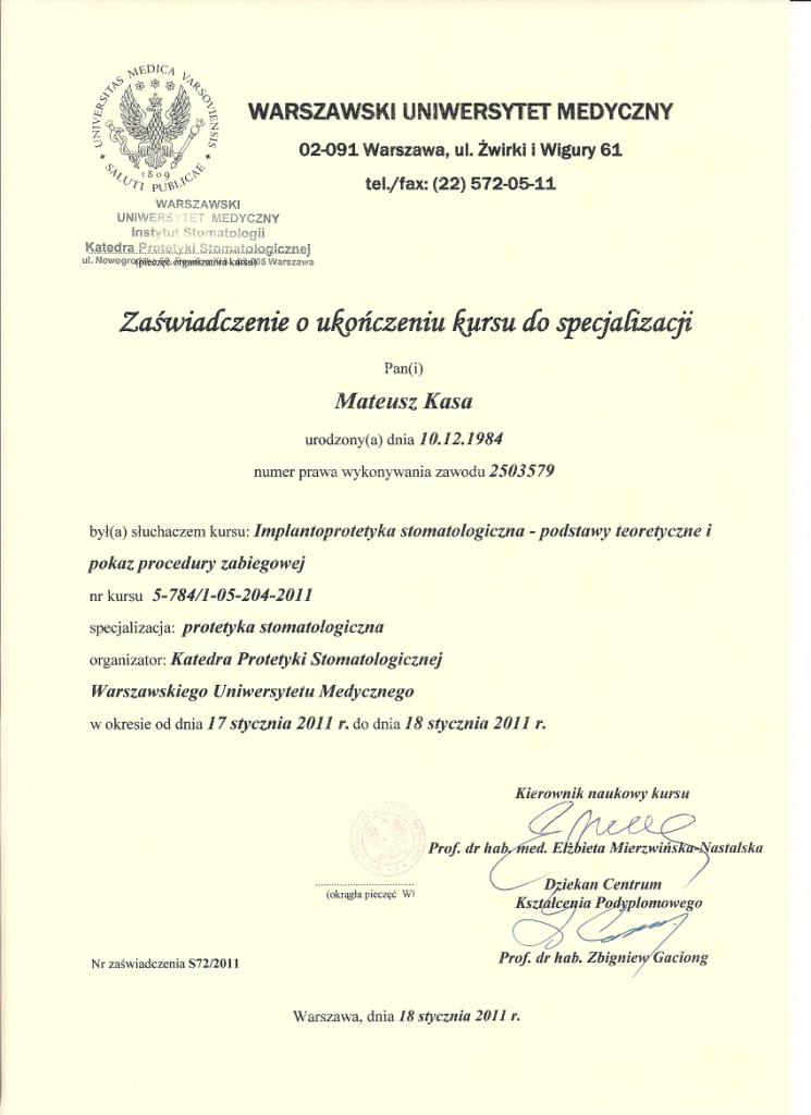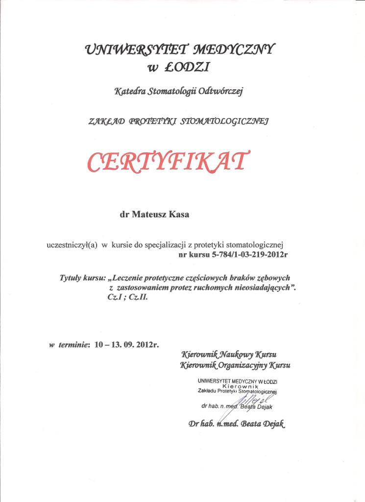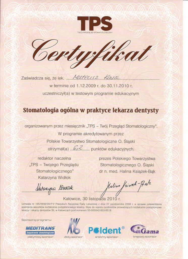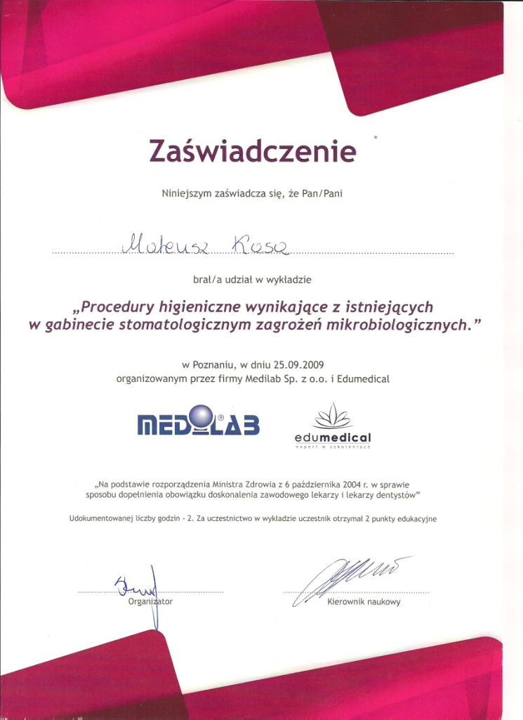 W 2008 roku ukończyłem studia na Oddziale Stomatologii Wydziału Lekarskiego Collegium Medicum Uniwersytetu Jagiellońskiego. W trakcie 5 lat rezydentury w Wojewódzkiej Przychodni Stomatologicznej zdobyłem ogromne doświadczenie w wielu dziedzinach stomatologii. W 2015 roku uzyskałem tytuł Specjalisty Protetyki Stomatologicznej. Wiedza teoretyczna i praktyka pozwala mi na interdyscyplinarne leczenie pacjentów z różnymi chorobami w obrębie jamy ustnej.